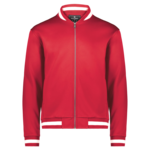 * 100% polyester double-knit * Woven label * Front zipper * Set-in sleeves * Front pockets * Dual inside pockets * Striped rib-knit collar, cuffs and bottom band