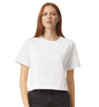 American Apparel Ladies 4.3 Ounce Fine Jersey Boxy T-Shirt. 100% ring spun cotton. 4.3 ounces. Non-topstitched, classic width, rib collar. Taped neck and shoulders for comfort and durability. Boxy fit, slightly, cropped, side seamed body. 100% cotton thread on color white, recycled tear away label.